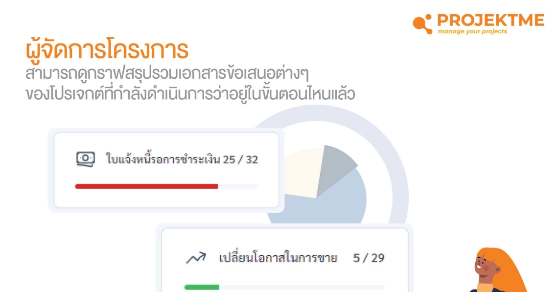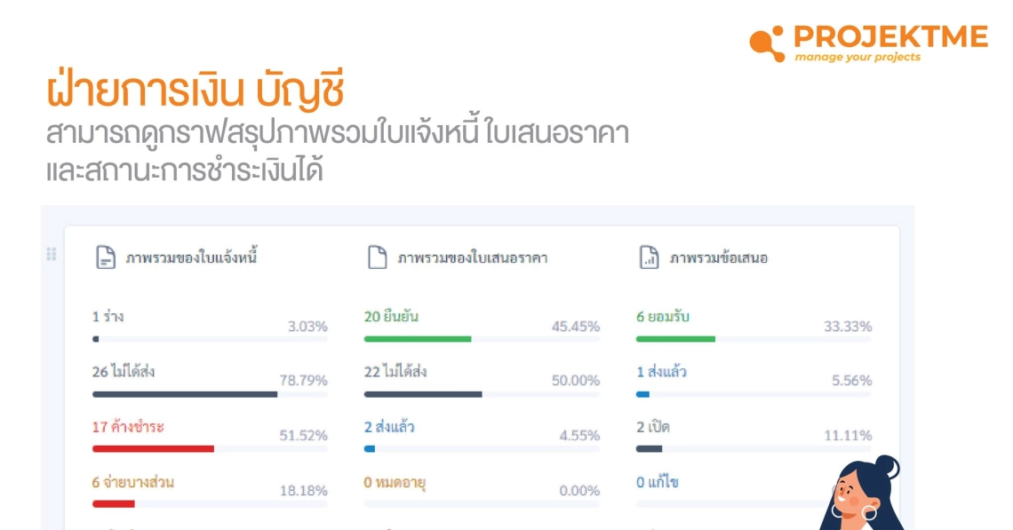 ProjektME ช่วยให้คุณทำงานง่ายและสะดวกขึ้น ด้วยการรวมฟังก์ชันสำคัญๆ ทั้งหมด สรุปออกมาเป็นกราฟ / แผนภูมิที่สามารถเข้าใจได้รวดเร็วและเห็นภาพรวมในส่วนต่างๆ ของงานทั้งหมดของคุณจบได้ในแดชบอร์ดหน้าเดียว???? พนักงานทุกตำแหน่งสามารถใช้ประโยชน์จากแดชบอร์ดหน้าเดียวได้แบบคุ้มค่า