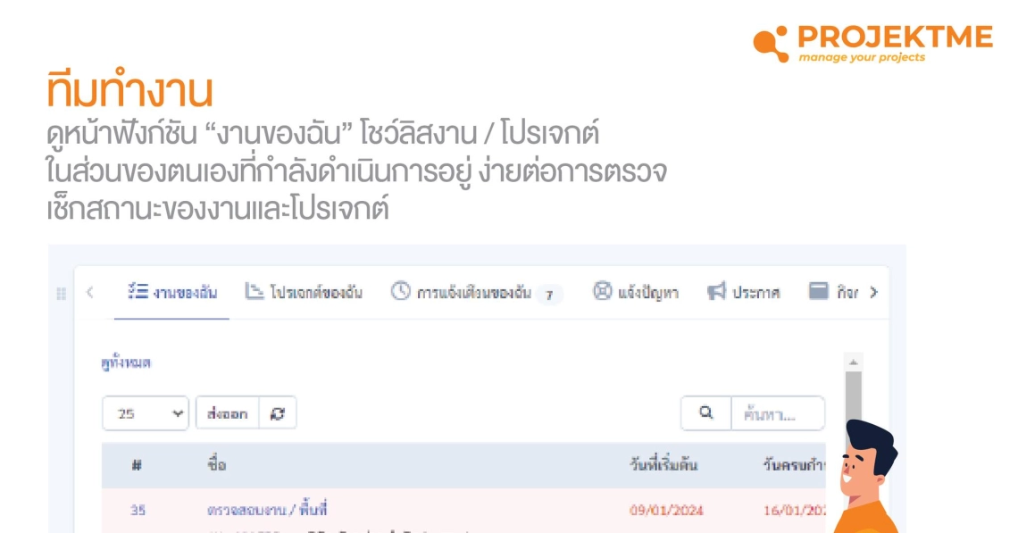 ProjektME ระบบจัดการอัจฉริยะครอบคลุมทุกกระบวนการทำงาน ให้คุณใช้ประโยชน์จากฟังก์ชันต่างๆ ได้แบบครอบคลุม ไม่ว่าตำแหน่งไหน ระบบ ProjektME ก็ซัพพอร์ตการทำงานของคุณให้ง่าย สะดวก รวดเร็ว และมีประสิทธิภาพยิ่งขึ้น