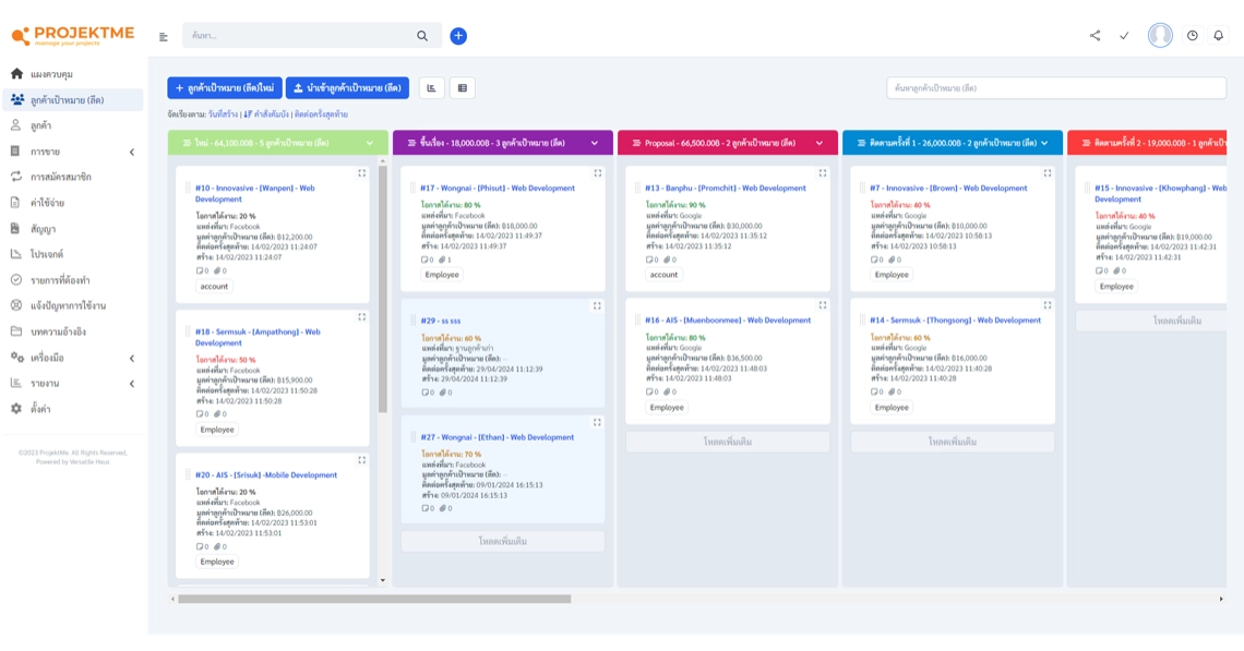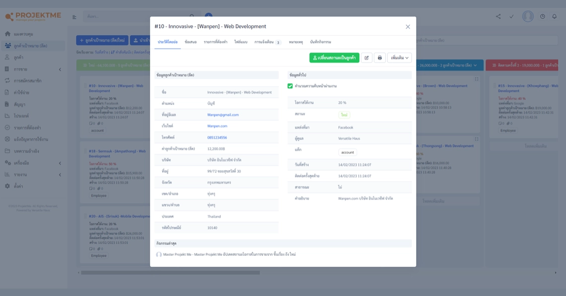 ด้วย ProjektME ที่ได้รับการออกแบบและพัฒนาขึ้นมา คุณจะไม่มีวันลืมผู้มีโอกาสเป็นลูกค้าของคุณ และคุณจะสามารถจัดการลูกค้าทั้งหมดได้ในที่เดียว ติดตามโอกาสในการขายในที่เดียว และติดตามความคืบหน้าได้อย่างง่ายดาย
